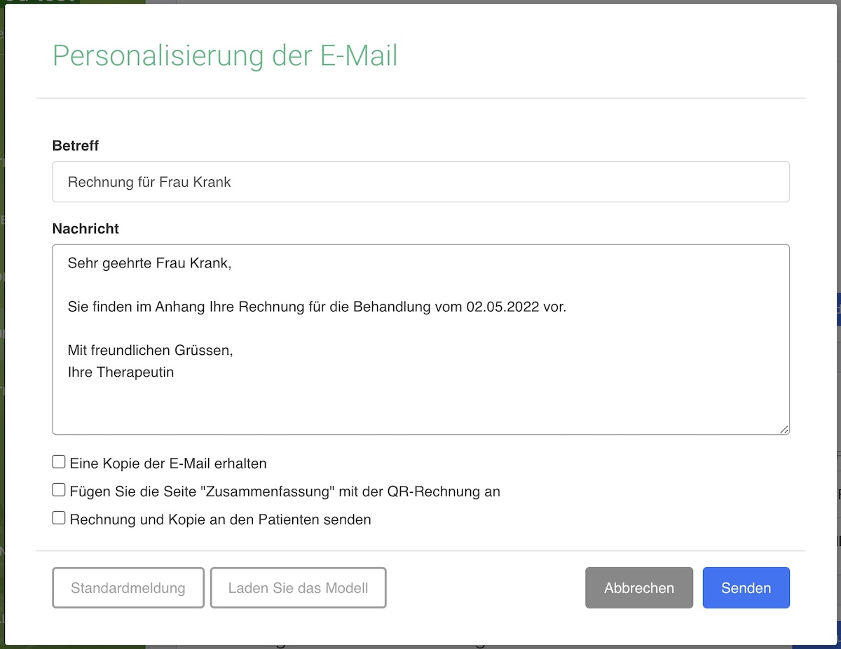 Nachdem Sie auf der Detailseite einer Rechnung auf die Schaltfläche "Per E-Mail versenden" geklickt haben, haben Sie die Möglichkeit, den Inhalt der E-Mail anzupassen oder eine E-Mail-Vorlage zu laden.
